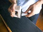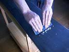 | 5. | スクレパーで表面の余分なワックスを削りおとします、削りカスがでないまでにきれいにはがしましょうこのときノーズからテール方向に 削っていきます。 |
