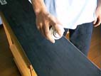 | 4. | ワックスが乾いたらよくなじむようにコルクで擦るようにしてワックスを伸ばします。やり方は摩擦熱で練り込むように浸透させノーズからテールに 伸ばしていきます。 |