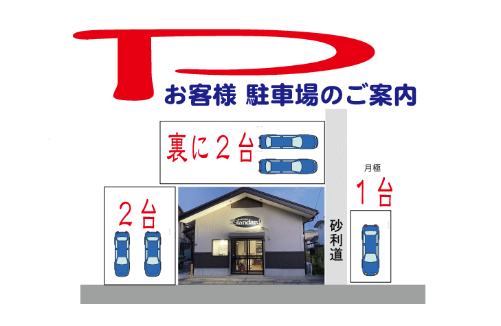 (駐車場は店前に2台、店裏に2台、隣に月極1台)