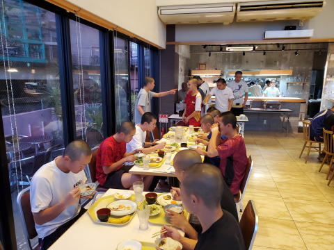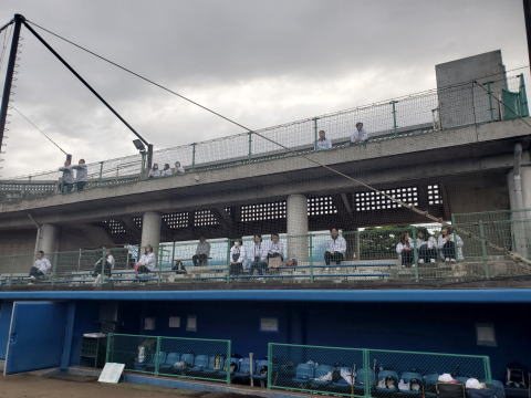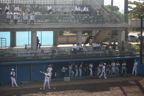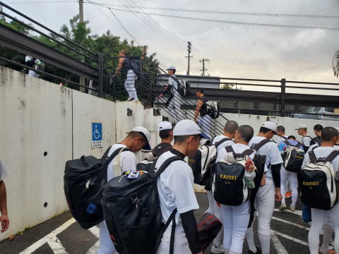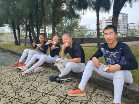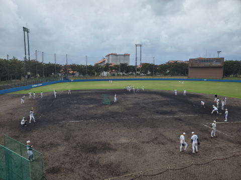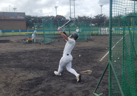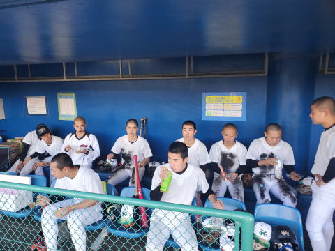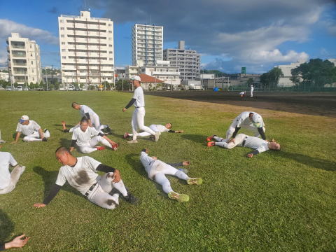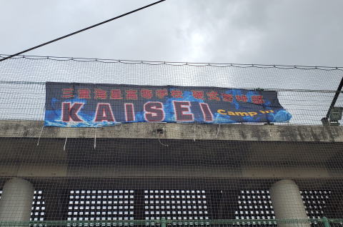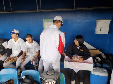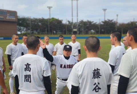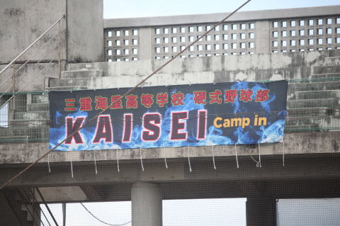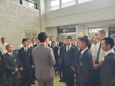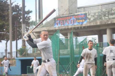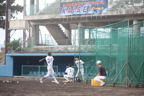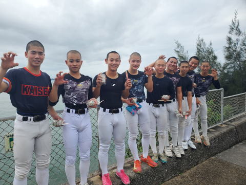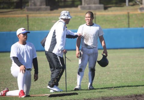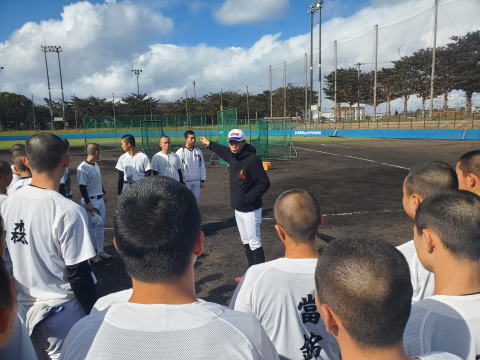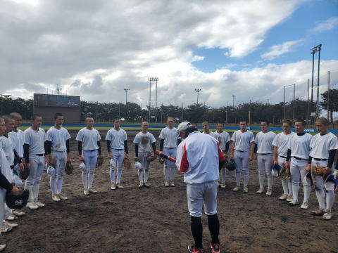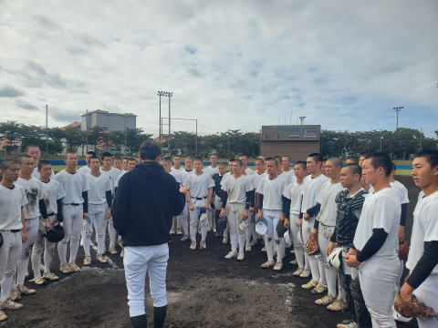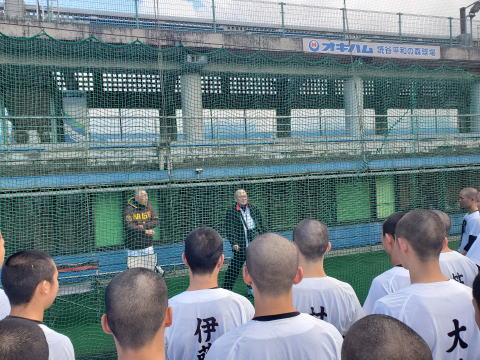国頭村でキャンプを行っている東邦高校野球部のOB会・大橋会長が、海星高校のキャンプを激励視察していただきました。 |