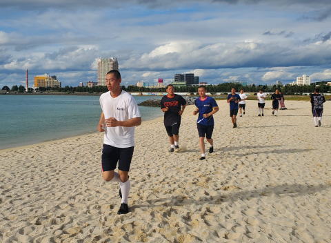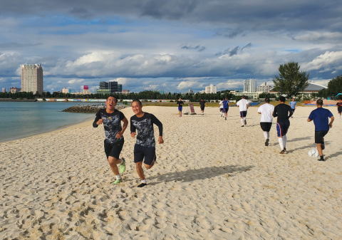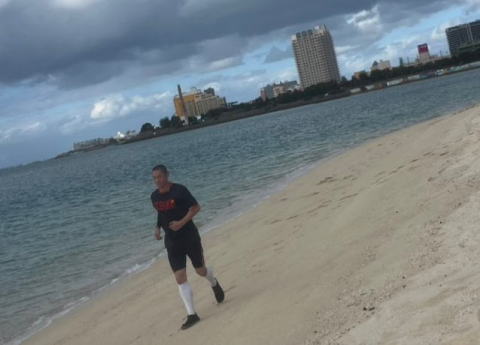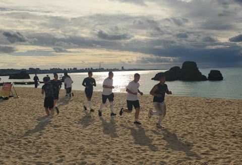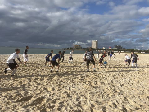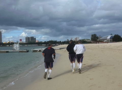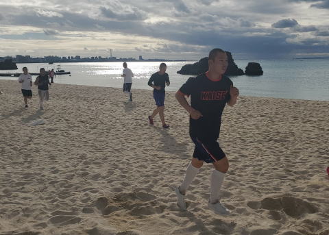 地下足袋やビーチシューズを持参して、投手陣はビーチでトレーニング。 |
