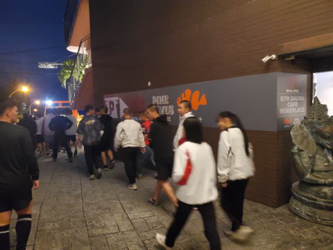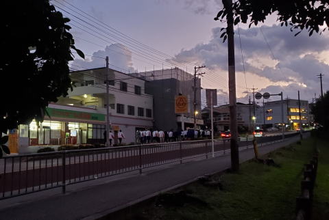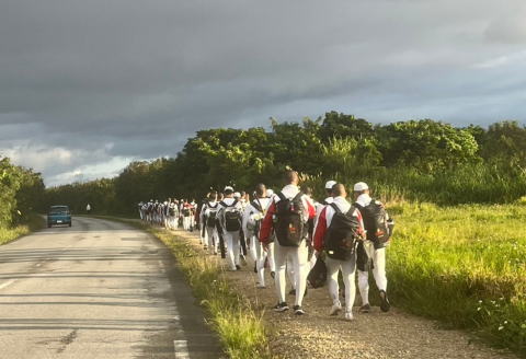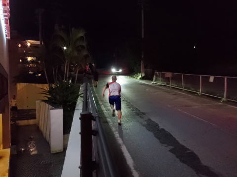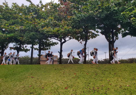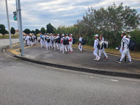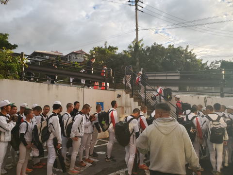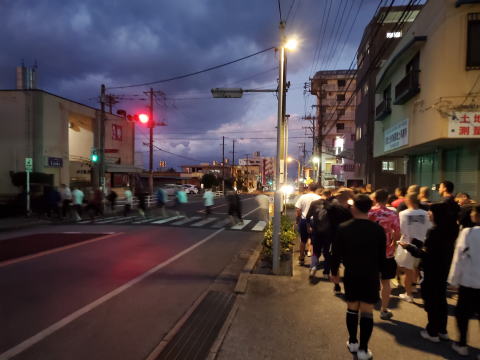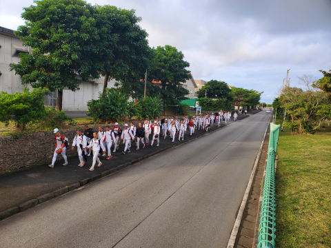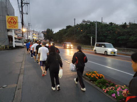 8時、ホテルから読谷球場まで徒歩で向かう。 |