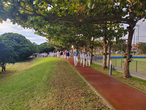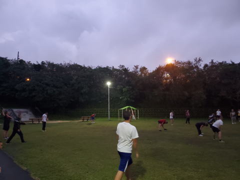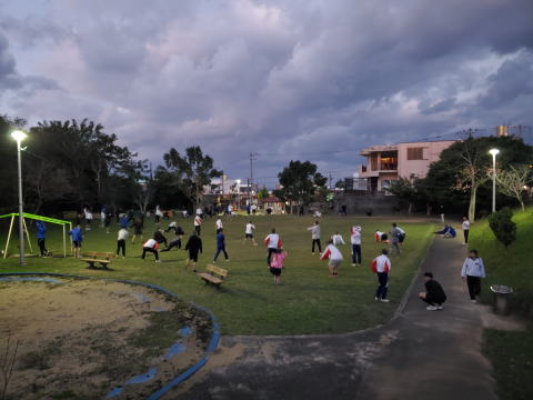 6時45分から朝の散歩。近くの公園でゴミ拾いのあと体操。 |