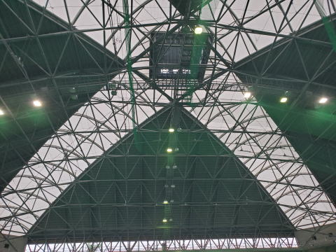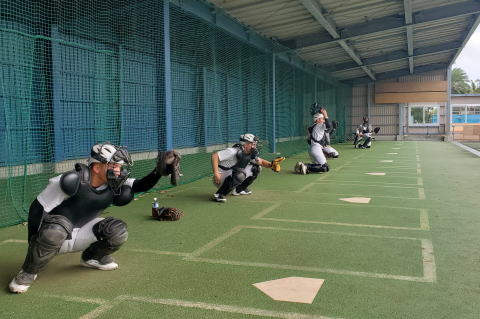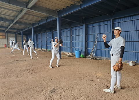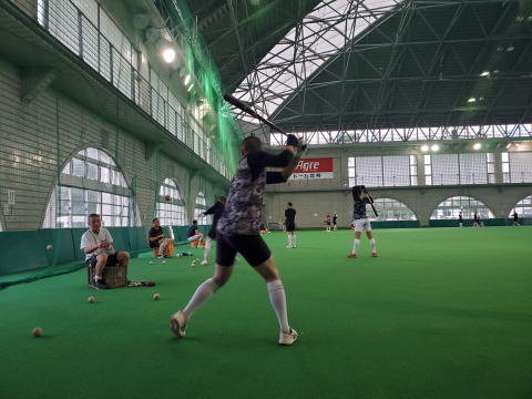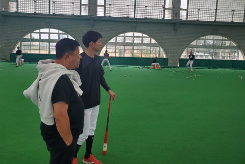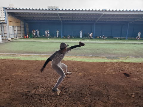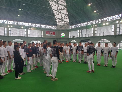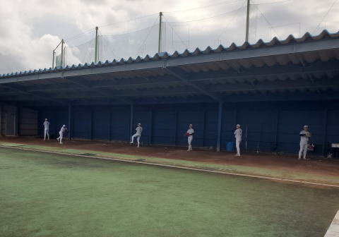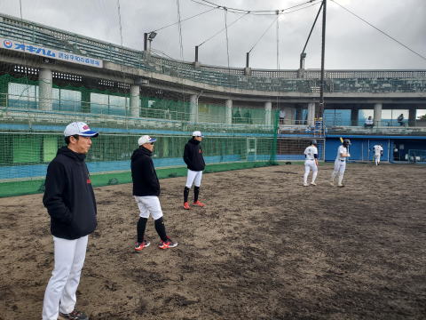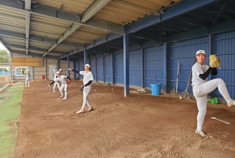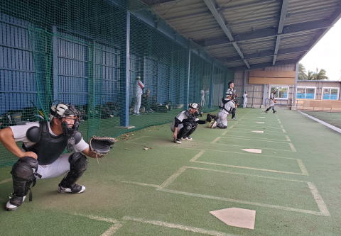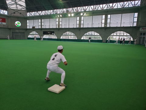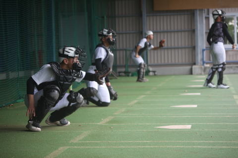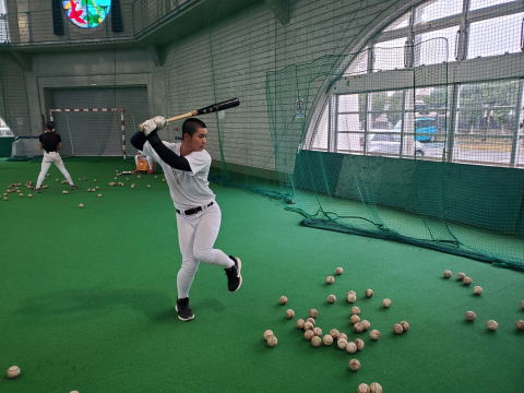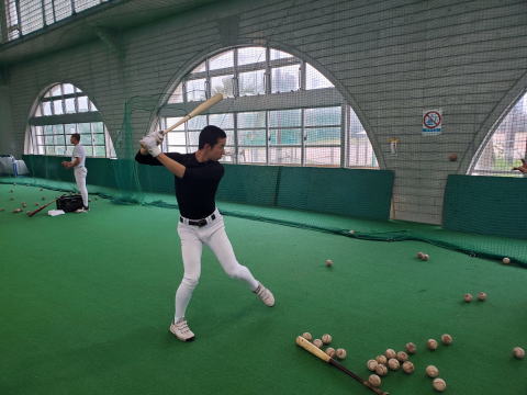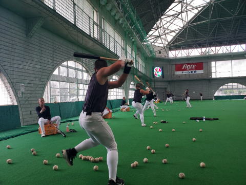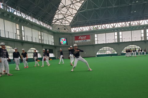 急な雨のため、野手陣も北谷に移動し、ドームで練習を行いました。 |