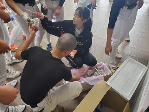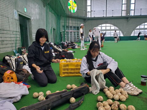 雨で濡れて汚れたボールの手入れをしてくれるマネージャー。 |