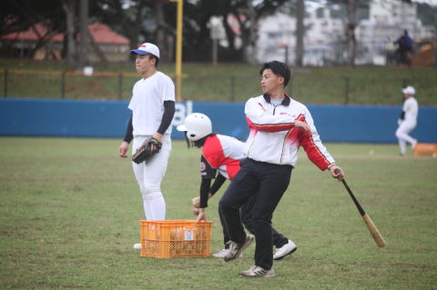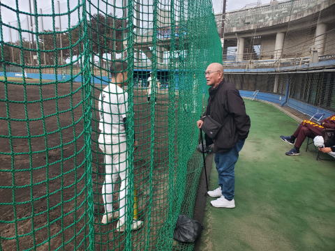 投内連携練習でノックバットを握る葛原アドバイザー。 |
