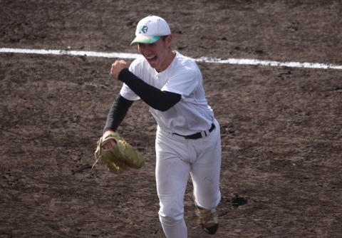 三振に打ち取り、雄たけびをあげる加藤楓太投手。 |