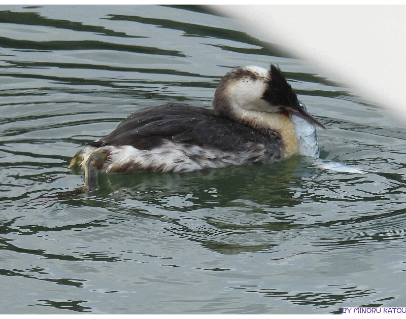 カンムリカイツブリ冬羽がマイワシを捕食(gifファイル)