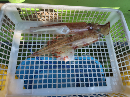 | ・ゲスト | ナシ | ・特記事項 | 釣り人7名。アタリは3回あり、2尾あげられた。内、1尾はフグにかじられたが取り込めた。 |