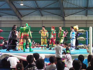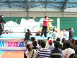 試合的には8人(と1匹?)入り乱れての大乱戦、カラスコは要所でガス攻撃!