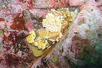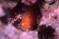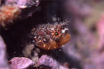 2003年初ダイブ、今年も女川です。酒田の朝は大雪だってえのに女川はイイ天気。 はっきり言って、いやになっちゃいます。 海もべた凪、透明度もまずまず。前週は大時化だったという事で、これも人徳のなせる技か?! 海の中ではクチバシカジカが卵を守っている姿があちこちで観察されます。 他にはフサギンポも、タイヤの中に産み付けた卵を守ってました。 今回一番の狙いはコクチクサウオでした。これがなかなか見つからかったんだけど最後になって オレンジの個体が現れました。 他にはアキギンポの幼魚?やガーベラミノウミウシ、そして初めて見る正体不明の魚がおりました。 |