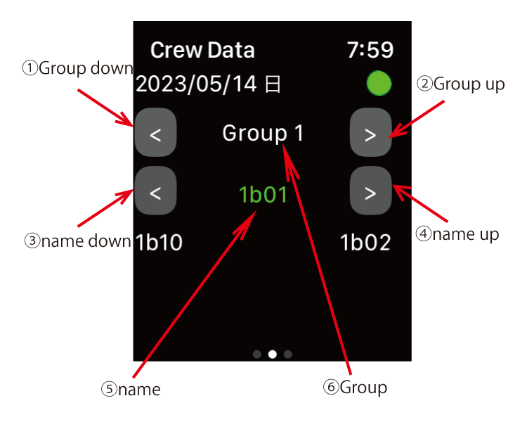 Group and member change 01 ①② change group You can change from 1 to 7 groups. ③④ Change member button The changed name is displayed below the button. Every time you press each button, it communicates with the iPhone and when the communication indicator turns green, synchronization is complete. If the communication indicator remains orange, it means that there is no iPhone nearby or the main app is not running. |