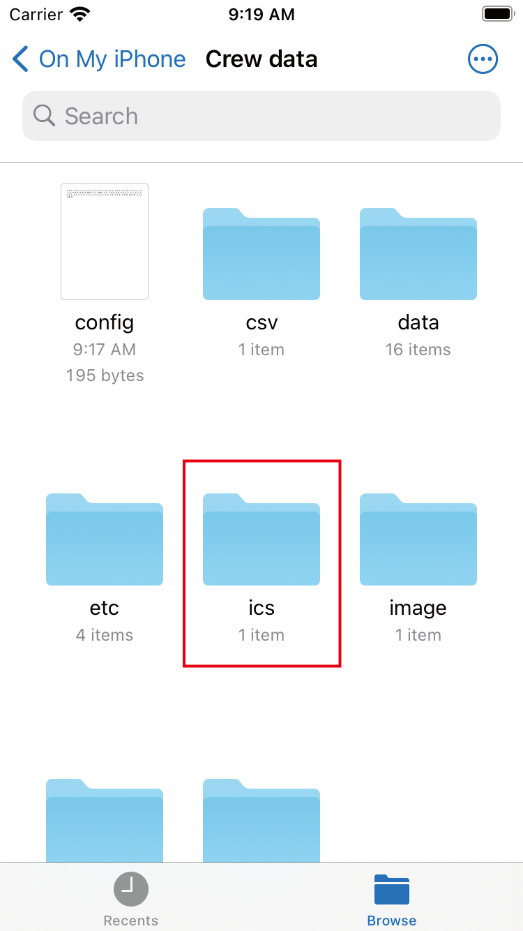 05.Create ICS and CSV files Click on the 'Crew date' folder. If you have multiple apps installed on your iPhone, there are folders for other apps, so scroll the screen or use search to find and click. |