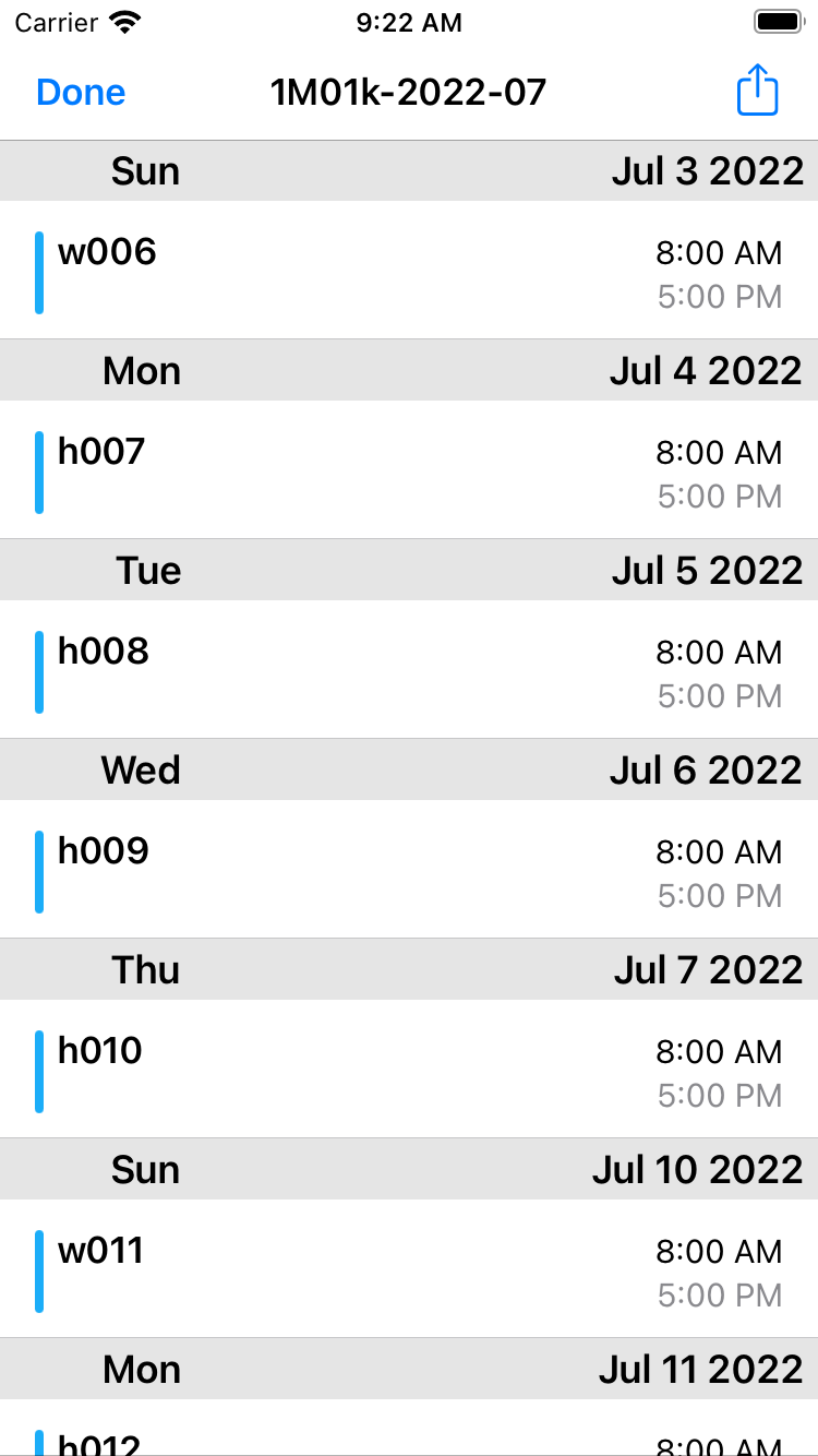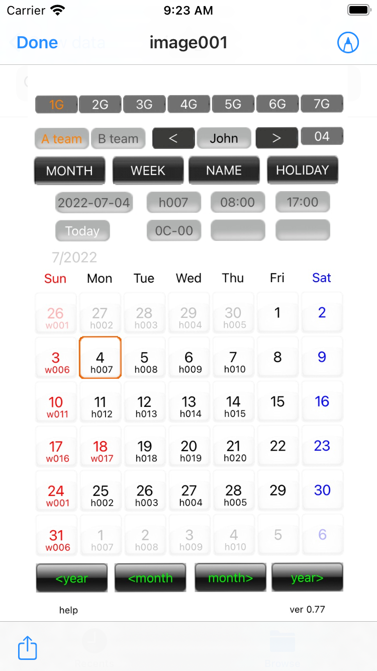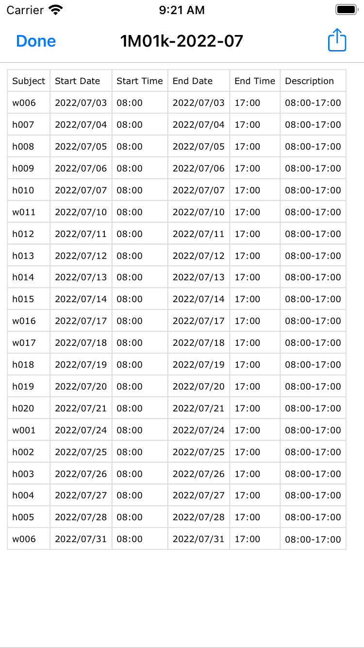 09.Create ICS and CSV files An ics file is a file in a format that can be used with the calendar app for iPhone and Mac. The iPhone calendar app can't import files directly from the iPhone (I don't know why). You can use the file sharing function to send yourself an email (as an attachment), open it, and import it into your iPhone's calendar. Mac calendar software can import each file as a new calendar. This time there is one file, but if there are multiple files, please search for the one you need by file name. File name rule is "1m01k-2022-07.csv" first digit is group, m is 'A team', c is 'B team', next 01 is member number, k is 'area 1', d 'area 2', 2022 is the year and 01 is the month. |