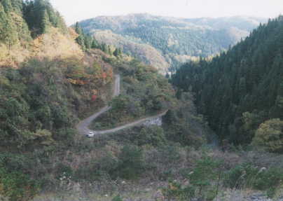 ダムまでの道を振り返ってみました。右方面の暗い部分が谷間になり、