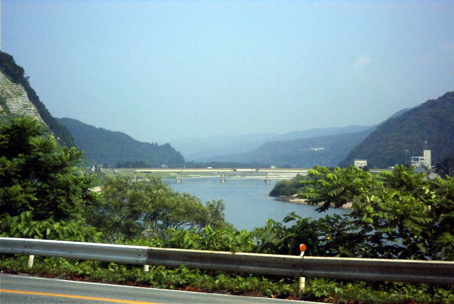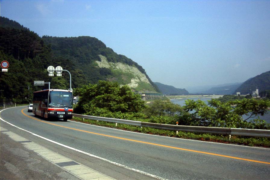 お客でにぎわっている白糸の滝ドライブインを過ぎて清川の大橋に近づく