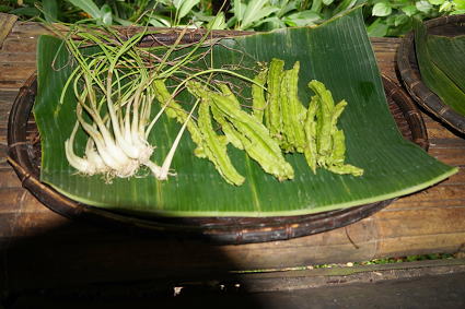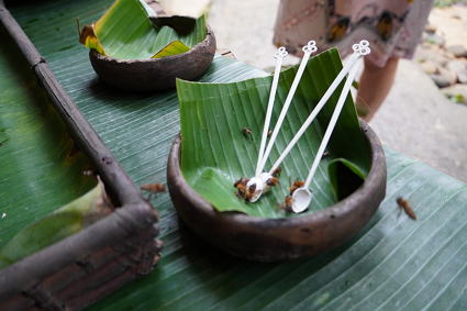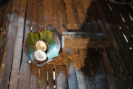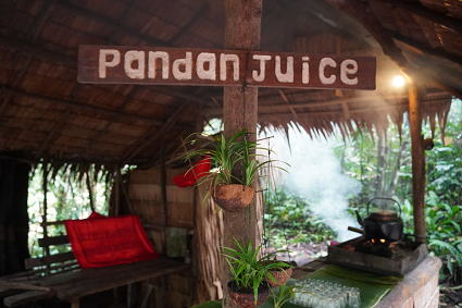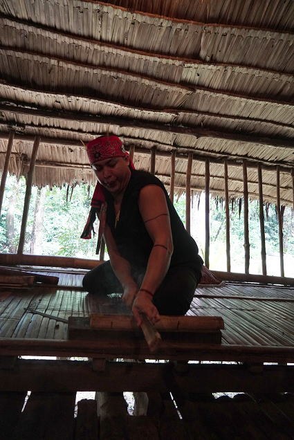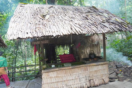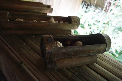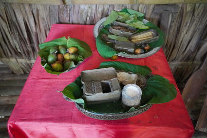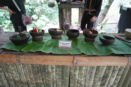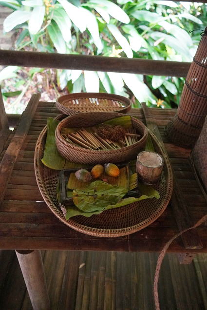ルングス族3(パンダンジュースほか) ルングス族は手が器用で、ビーズのアクセサリーや 伝統布の細工物などが目についた。 戸外ではパンダンという植物を使ったお菓子作りとジュースが・・・ 甘い香りがしておいしかった! |