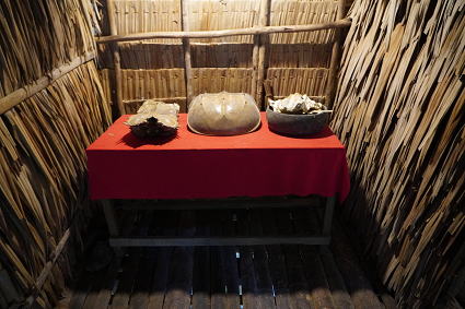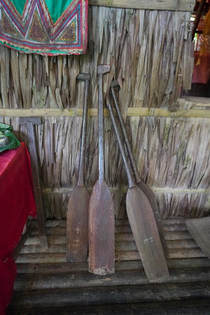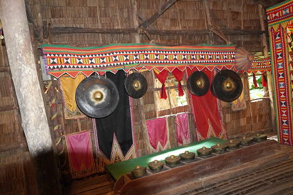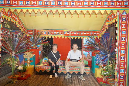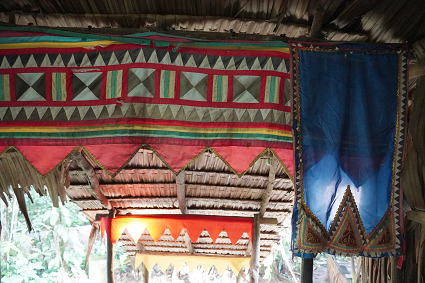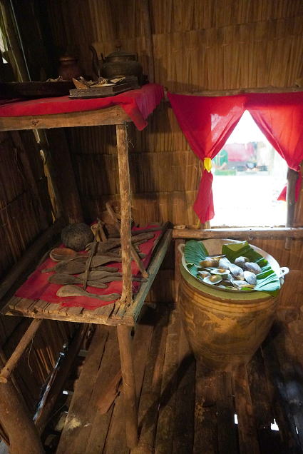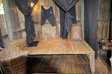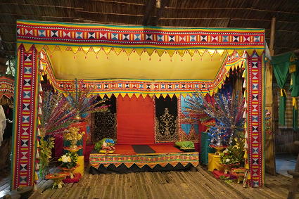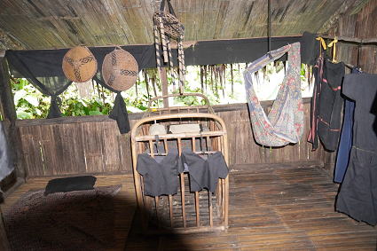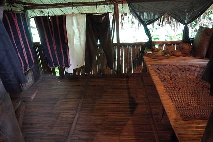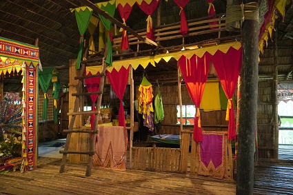 バジャウ族2 バジャウ族の内部は色鮮やかな布で飾られている。 部屋の中心は豪華に飾り付けられた夫婦の居間。 その横には二段部屋。 上階が夫、下階は妻。 寝るときには梯子がはずされるとか・・・ |