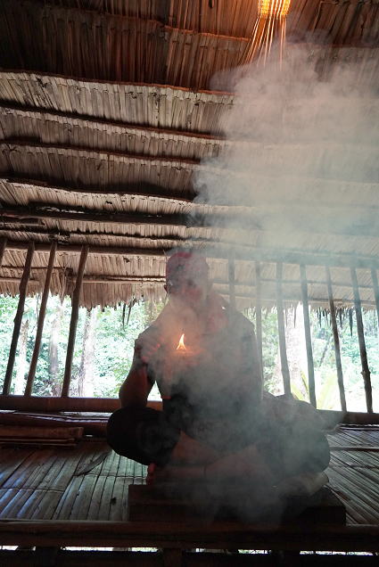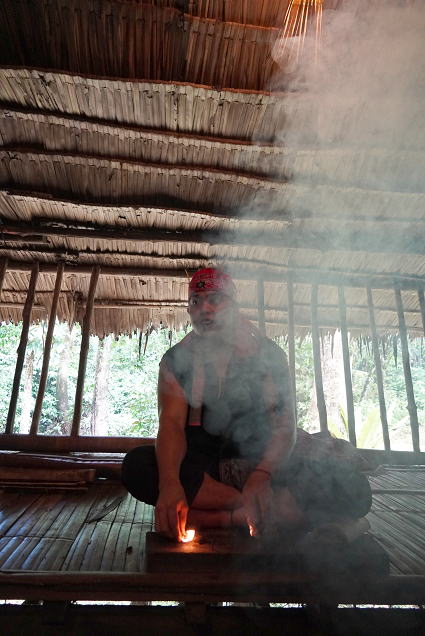 ルングス族2(火おこし実演) ルングス族のお部屋では火おこしの実演があった。 木と木をこすり合わせ、摩擦熱で火をおこす。 切状のものと違って苦戦していたが、 見事に火を起こした・・・ |