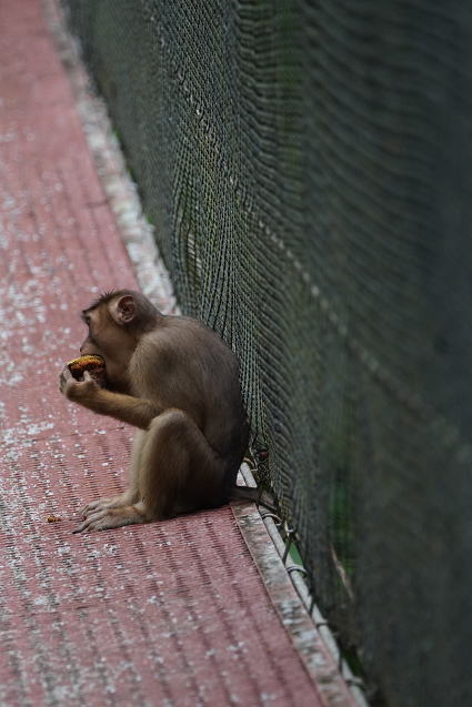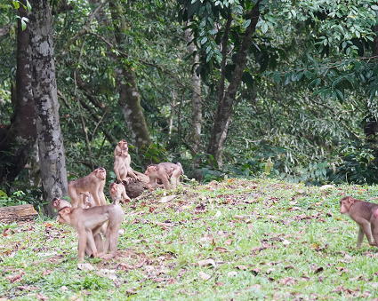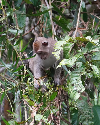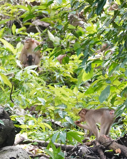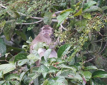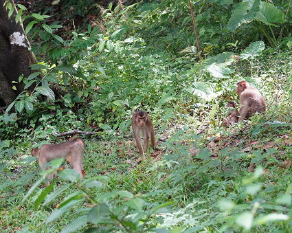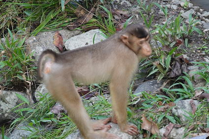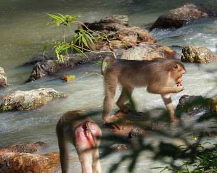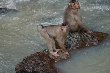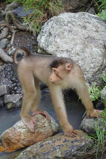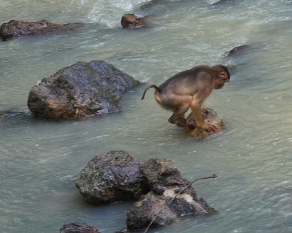 | ブタオザル1 リゾートのメインロッジは既にブタオザルに占領されていた。 裏山の森から侵入、川の中にはブタオザルが・・・ カニクイザルはカニを食うと聞くが、 ブタオザルは岩についたカワノリと思われるものを食べていた。 |