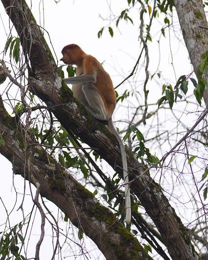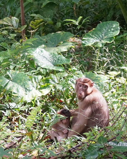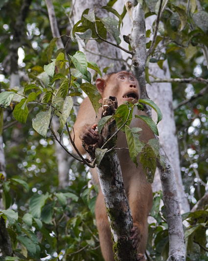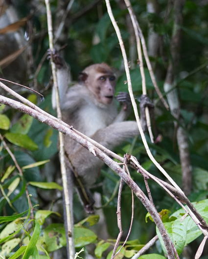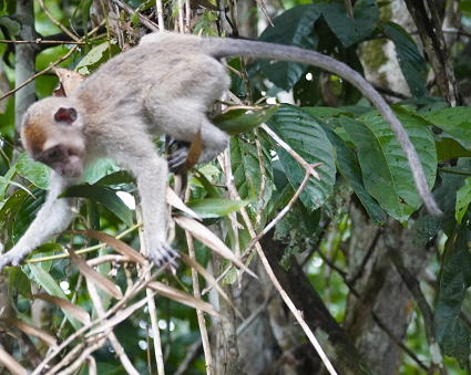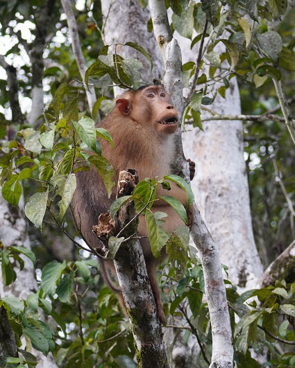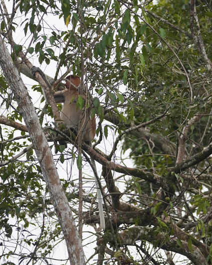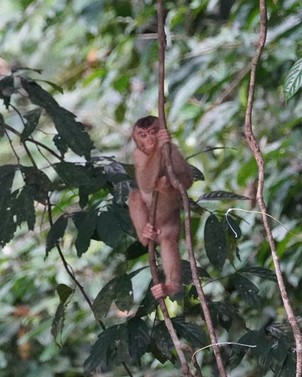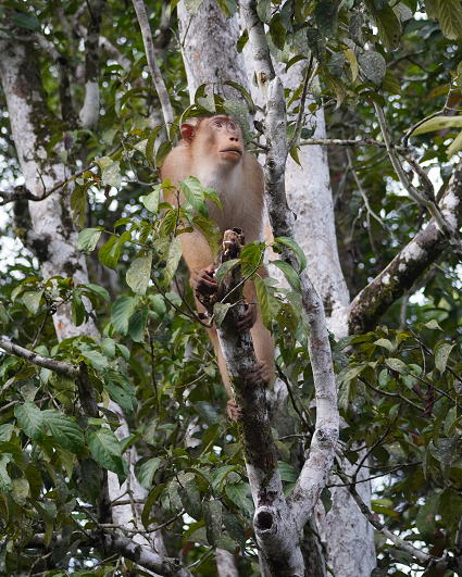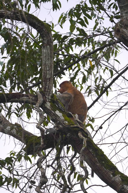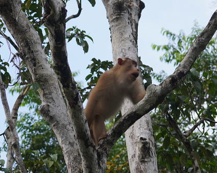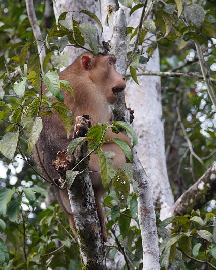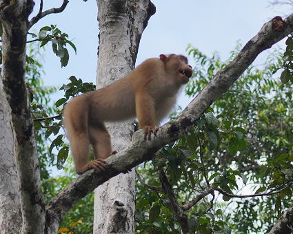 | ブタオザル1 翌日はタビンに移動のため早朝ボートクルーズ。 この日はあいにくの予報が雨・・・ 雨支度をして乗船、二人だけの貸切。 しかし、雨には降られず・・・ このブタオザルのオスの貫禄のあること。 |