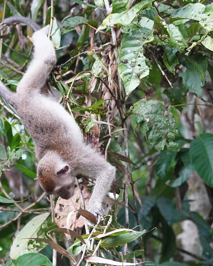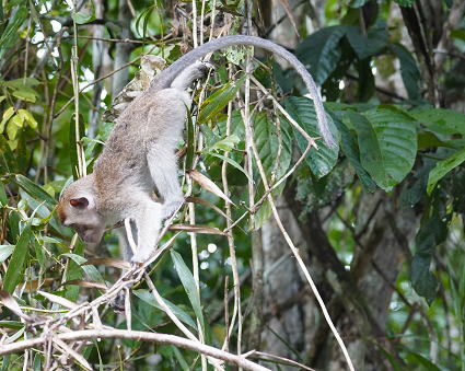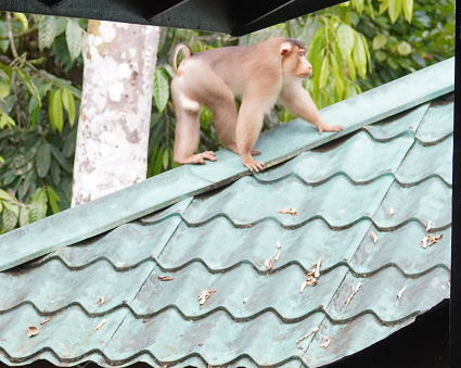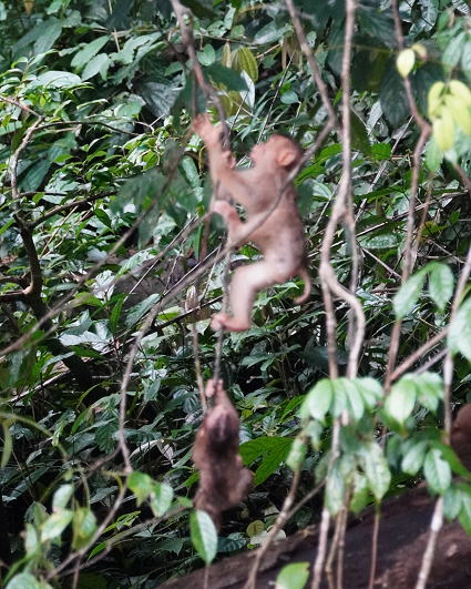 | カニクイザル6 ボルネオネイチャーロッジではロッジをとる囲むように現れ、 周辺の森でにぎやかに騒いでは去って言った。 特に子供たちは木々といわず、屋根上でも それは無邪気に遊び、人間にはお構いなし・・・ |