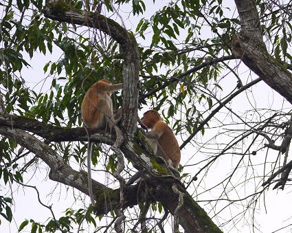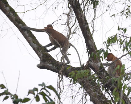 | テングザル2 早朝クルーズは雨模様のため、動物の出現が少な目。 そんな中、テングザルのメス軍団と出会う。 腹に子どもを抱えるハハザル。 お腹が膨らんでいるメスザル・・・ |