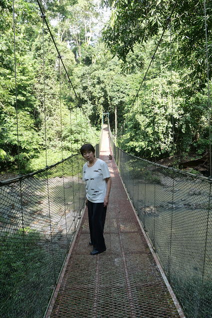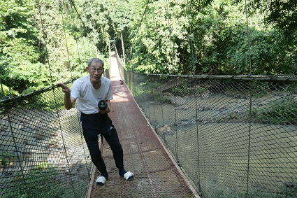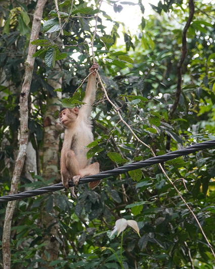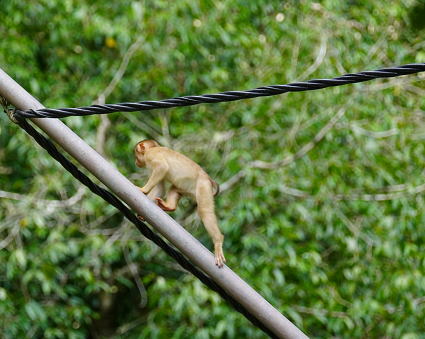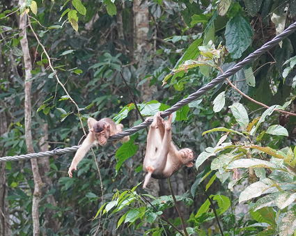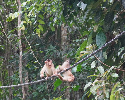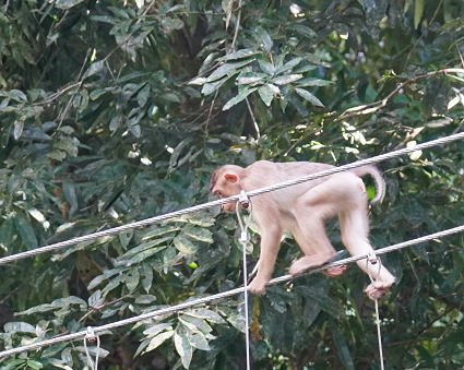 | ブタオザル3 リゾート内の川には吊り橋がかかる。 横着なサルはブリッジのワイヤーを伝って川を渡る。 こちらの方でも子ザルは遊びながらわたる。 よくも落ちないものとこちらがはらはら・・・ |