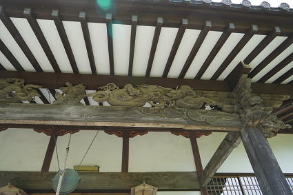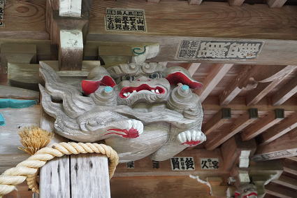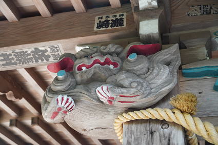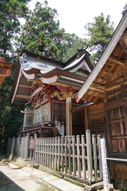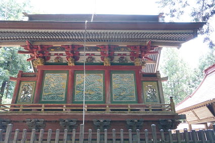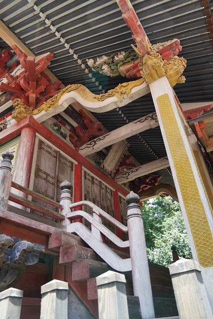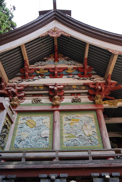 | 菅原神社2 現在の本殿は本殿内部の錦旗に文政5年(1822)の墨書名があり、 様式その他からそのころの建立と考えられる。 本殿は銅板葺の三間社流造で、彫刻も色鮮やかに残り、 江戸時代中期の建築様式を残していることから市の文化財になっている。 |