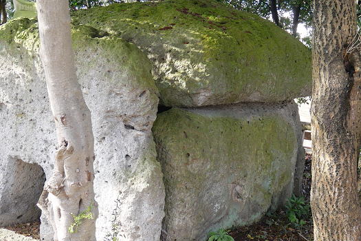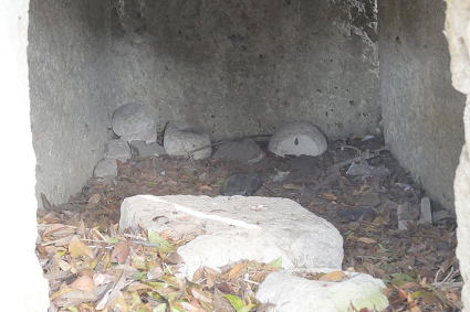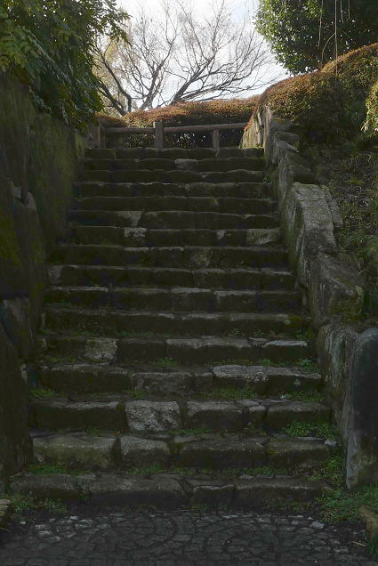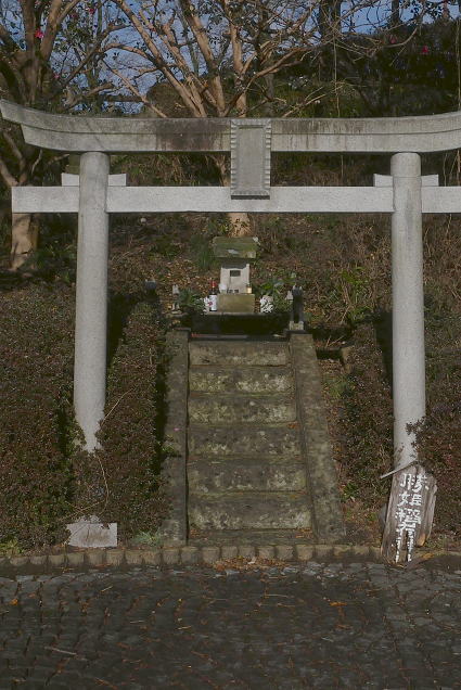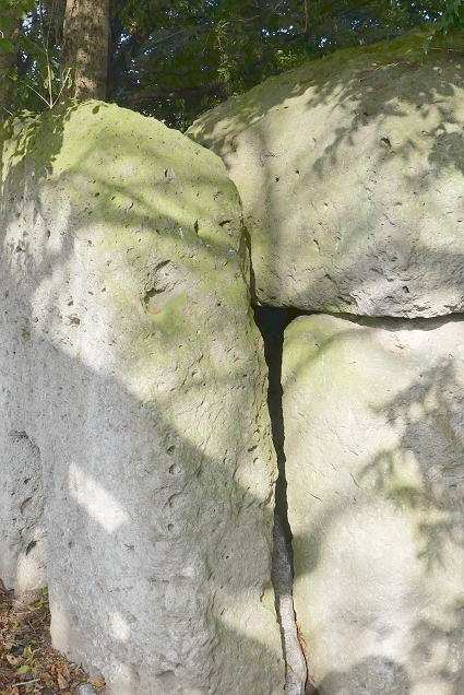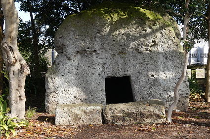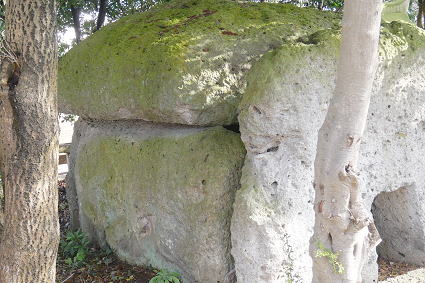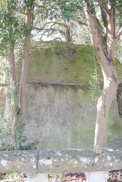 愛宕塚古墳(石室) この石室はこの地にあった全長約50~60mの愛宕塚古墳の横穴式石室。 忠霊塔を立てる際に掘り出され、約30mほど北に移設、復元した。 石室は凝灰岩製の切石で、側壁長さ2.5m、高さ1.6m、奥壁幅2.2m、高さ1.6m、 羨門(入口)幅2.3m、高さ2.1m、天井石長さ2.95m、幅2.4m、高さ1.2m。 特に羨門(入口)は板石をくりぬいて造っている。 |