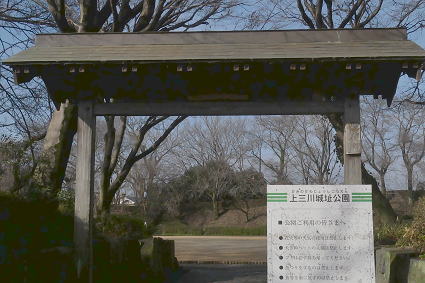 上三川城址1 上三川城は建長元年(1249)から慶長2年(1597)まで 350年にわたって栄えた中世の平城。 創建は宇都宮氏の一族、横田越中守頼業。 城壁、土塁、濠などがよく残っている。 東西90m、南北100mほどの方形の土塁に沿って堀に囲まれている。 |