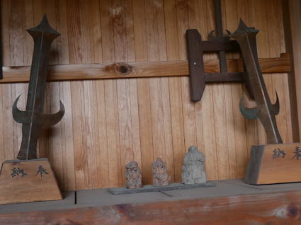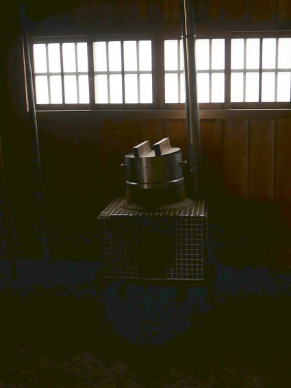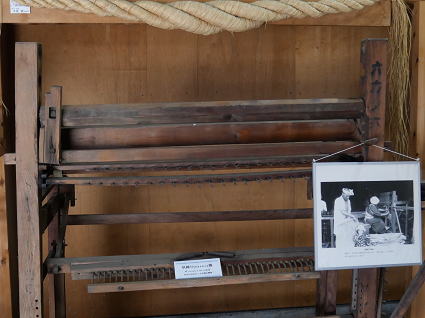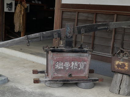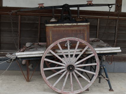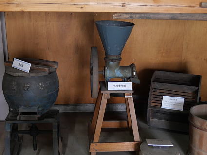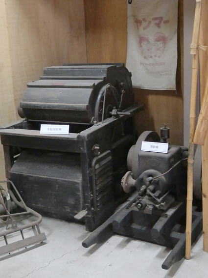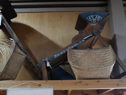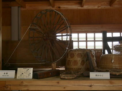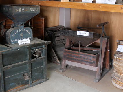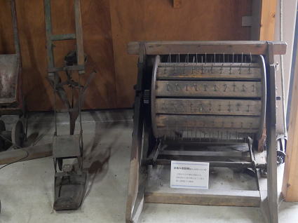 | 高根沢町歴史民俗資料館3 収蔵庫としての「長屋門」は農具館となっており、 手押しの消火ポンプをはじめ、農具が展示されている。 懐かしい脱穀機やいと車が並ぶ。 |