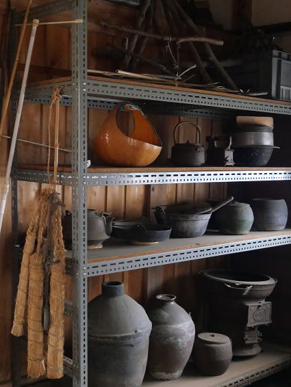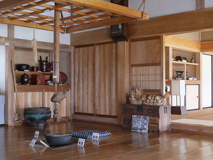 | 高根沢町歴史民俗資料館2 展示施設「本屋」は高根沢町の農家の様相を忠実に再現している。 入口に隣接して馬屋があり、土間続きで台所になっている。 居間には囲炉裏が掘られ、居心地の良い場所になっている。 古い高根沢町の豪農の住宅のようである・・・ |