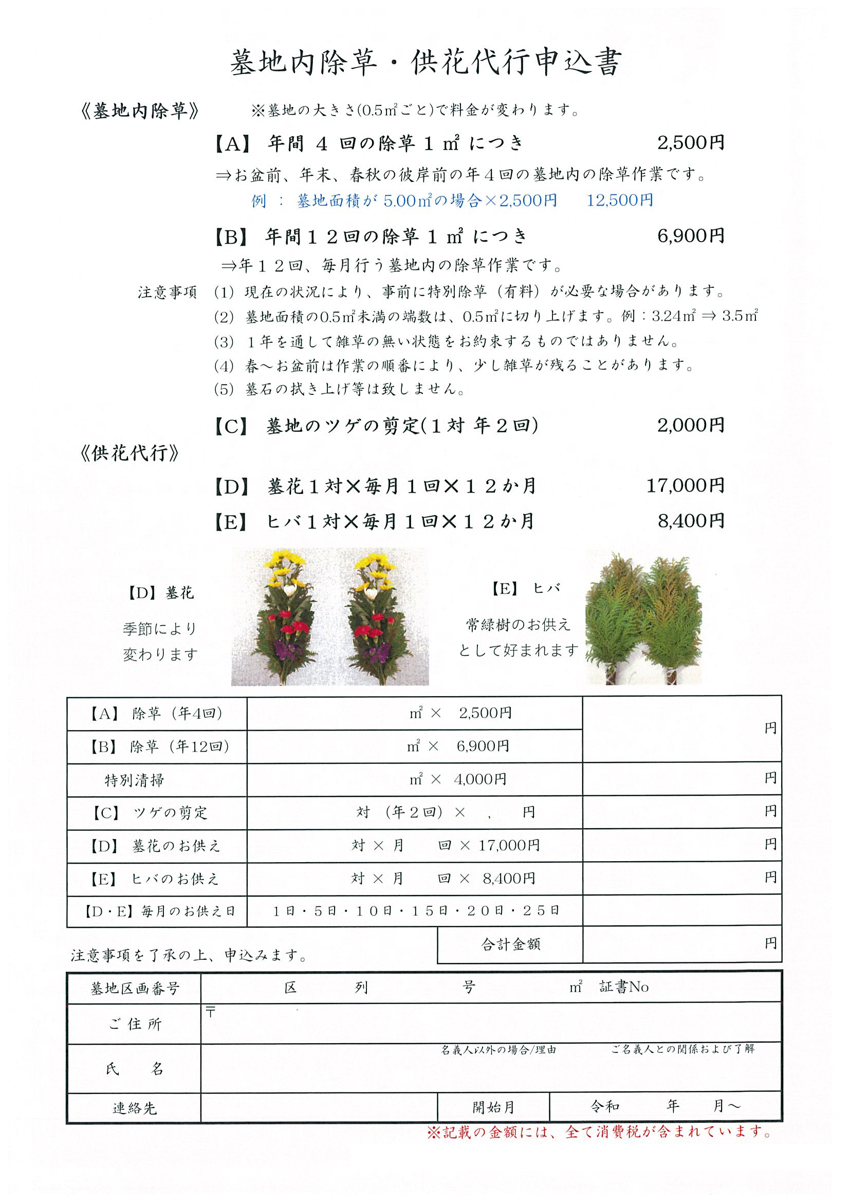 に必要事項を記入いただき、霊園寺務所 0743-73-2131 にお申し付けください。