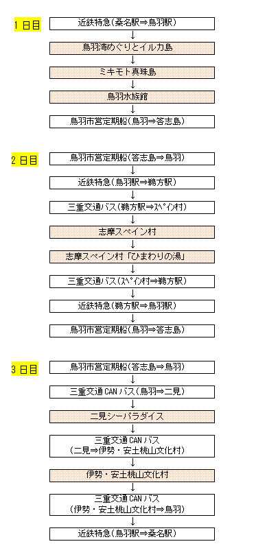 | ![]() イルカ島 ![]() ミキモト真珠島 ![]() 鳥羽水族館 ![]() 志摩スペイン村 ![]() CANバス ![]() 二見シーパラダイス ![]() 伊勢・安土桃山文化村 ![]() 伊勢志摩ライナー |