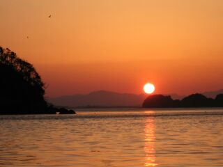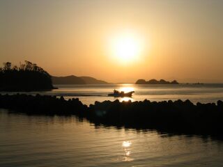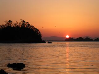 | 静かな空気の中で聞えるのは 波の音のみ。 眩しい太陽が山の端に近づくにつれ 優しい輝きに変化していく。 紅く染まった波の間を 船が通り過ぎる。 夕焼け空を残して 太陽は答志島から消えた。 | |